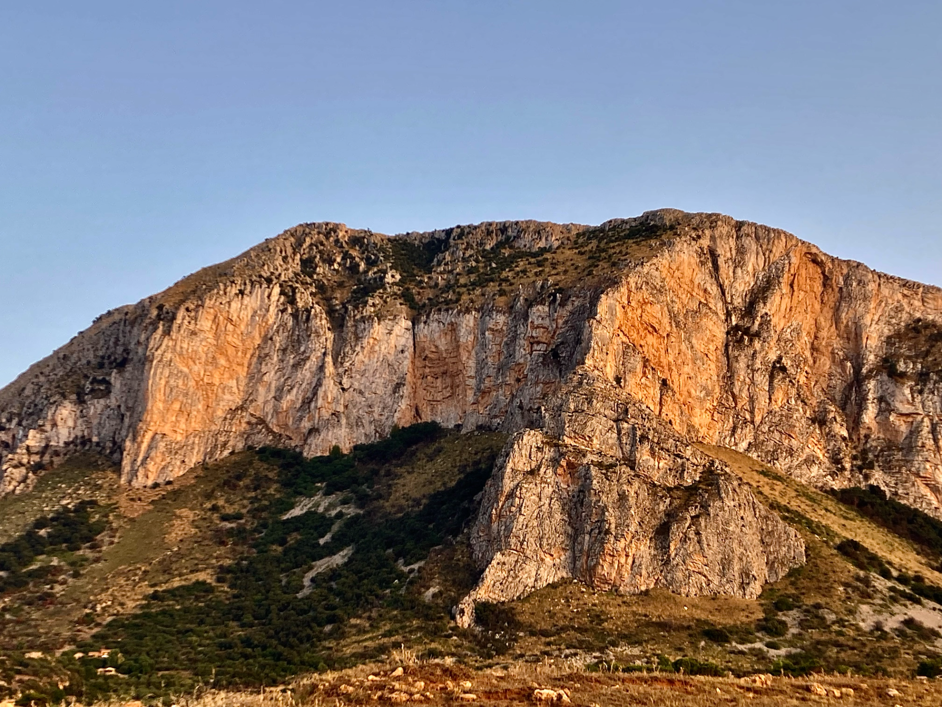 La falaise de Monté Cofano, au sein de la réserve naturelle, présente une architecture géologique remarquable. Composée principalement de calcaire sédimentaire, sa paroi affiche des strates horizontales clairement définies, ponctuées de fissures et de surplombs résultant de l'érosion marine et atmosphérique.