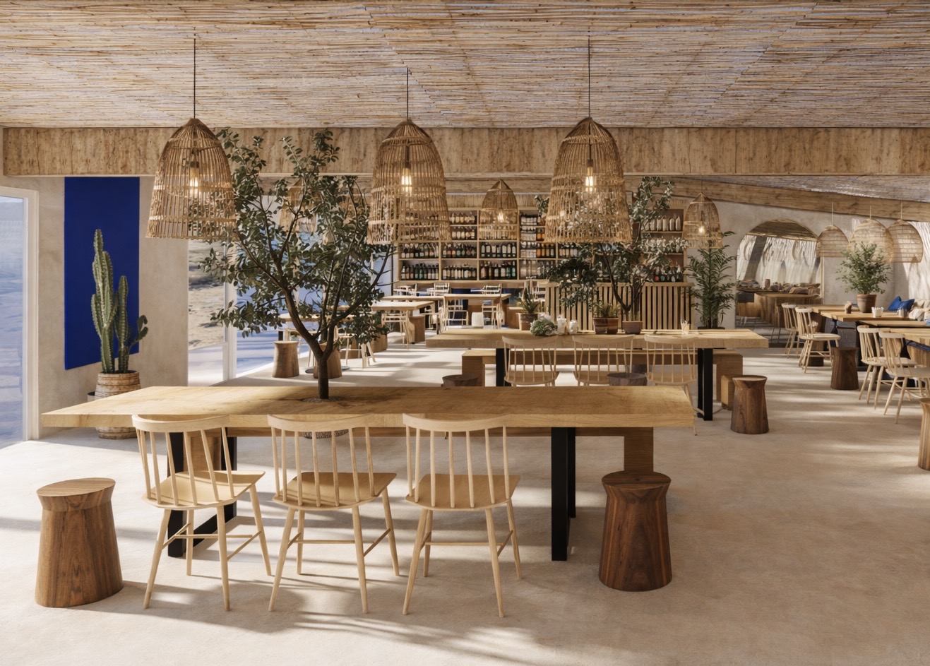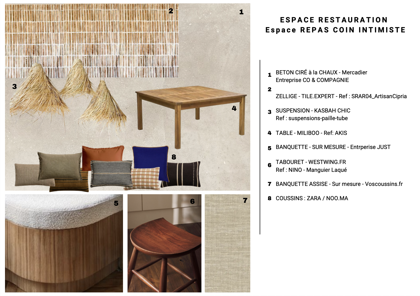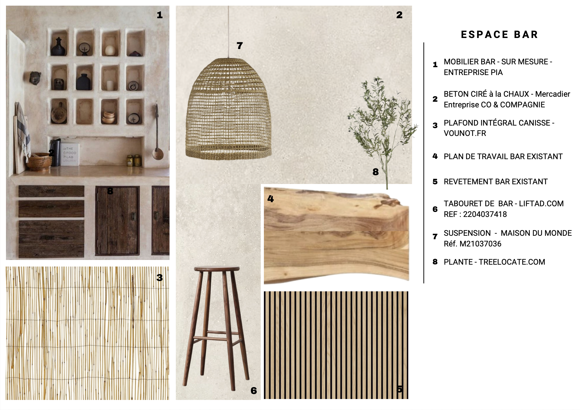 Le béton ciré, appliqué sur les sols et les murs, sera le matériau central de la rénovation. Il apportera une atmosphère dépaysante, inspirée des maisons grecques, tout en garantissant un entretien facile et une conformité aux normes M1. Le bois viendra réchauffer l'espace avec une touche rustique, présent sur le mobilier, le plafond et le bar. Le rotin, utilisé pour les suspensions, ainsi que des plantes évoquant les milieux arides comme les oliviers ou les cactus, renforceront l'inspiration méditerranéenne. Des canisses habilleront le plafond, associées à un éclairage LED dissimulé et modulable, créant l'illusion d'un espace extérieur. Enfin, quelques touches de bleu grec viendront dynamiser l'ensemble et apporter de la fraîcheur.