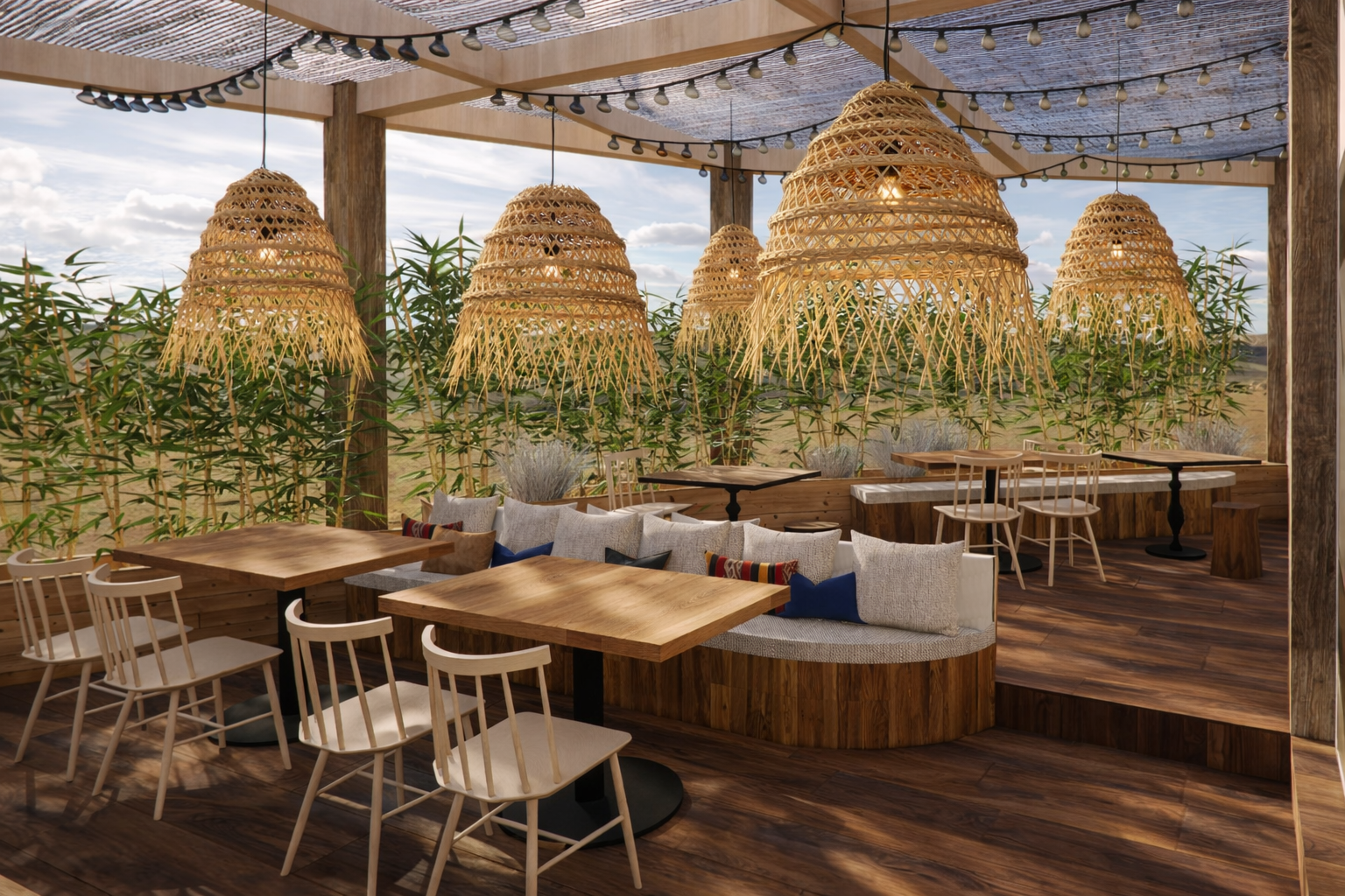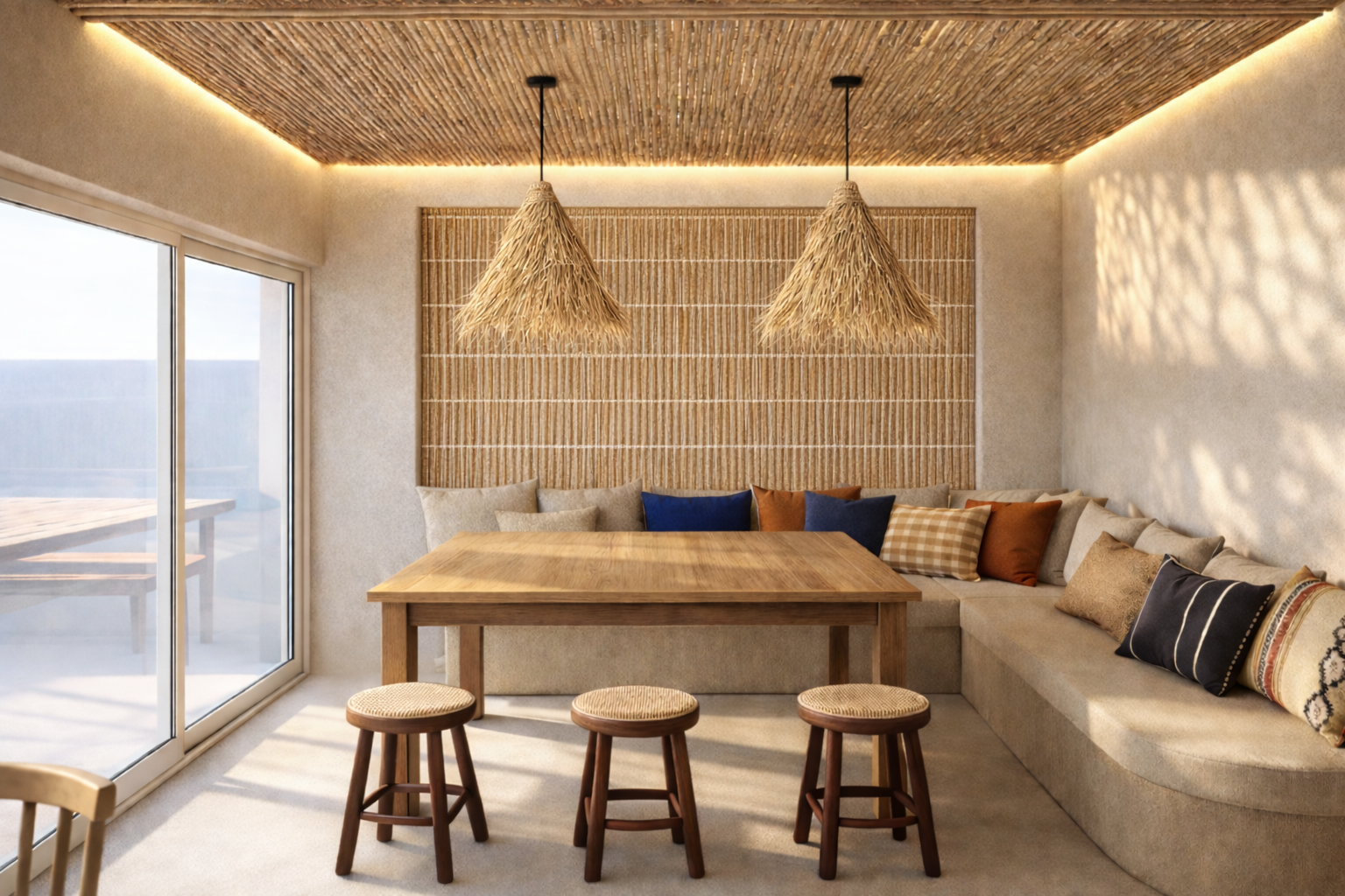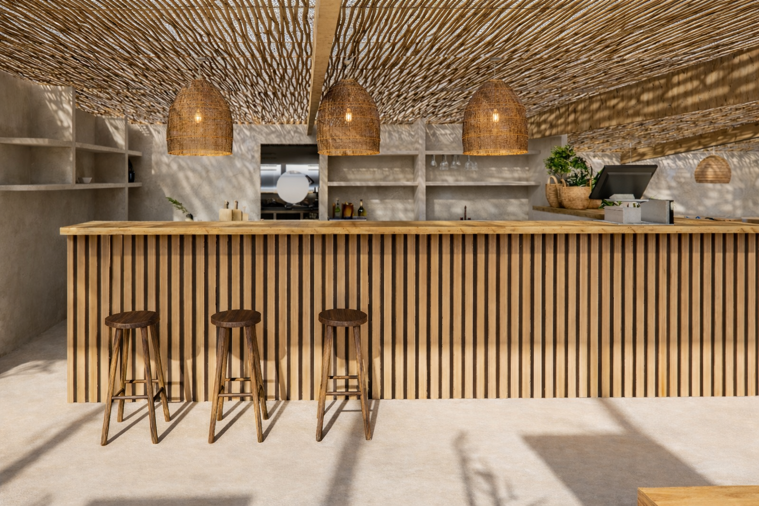Le béton ciré, appliqué sur les sols et les murs, sera le matériau central de la rénovation. Il apportera une atmosphère dépaysante, inspirée des maisons grecques, tout en garantissant un entretien facile et une conformité aux normes M1. Le bois viendra réchauffer l'espace avec une touche rustique, présent sur le mobilier, le plafond et le bar. Le rotin, utilisé pour les suspensions, ainsi que des plantes évoquant les milieux arides comme les oliviers ou les cactus, renforceront l'inspiration méditerranéenne. Des canisses habilleront le plafond, associées à un éclairage LED dissimulé et modulable, créant l'illusion d'un espace extérieur. Enfin, quelques touches de bleu grec viendront dynamiser l'ensemble et apporter de la fraîcheur.